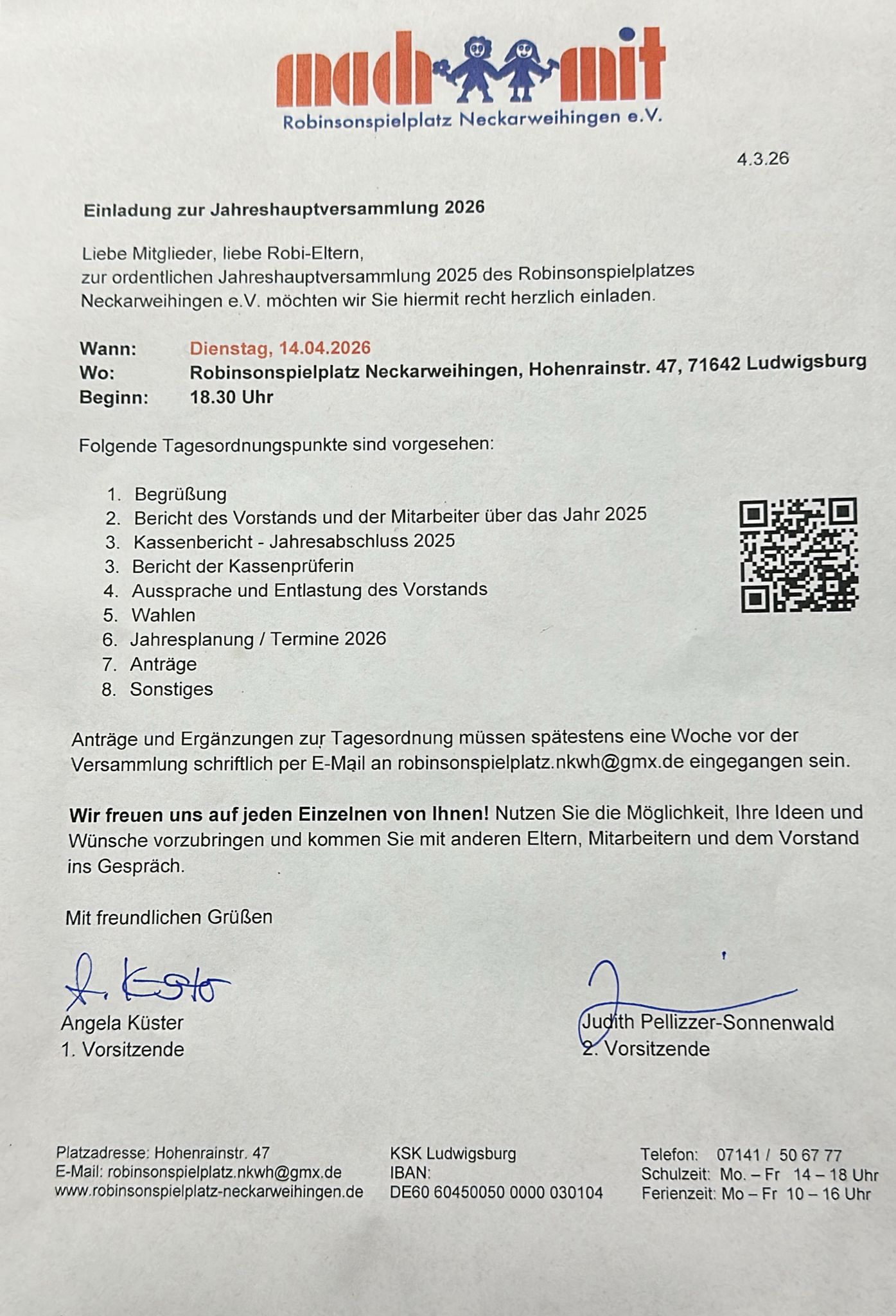 StartAktuelles vom Robinsonspielplatz Hier findest du alle Neuigkeiten, Hinweise und Ankündigungen rund um den Robinsonspielplatz Neckarweihingen. Aktuelles vom Robinsonspielplatz 5. Januar 2026 Kinderkleidermarkt 9. Mai 2026 Weiterlesen: Kinderkleidermarkt 9. Mai 2026 5. Januar 2026 Gemeinsam stark für den Robi Weiterlesen: Gemeinsam stark für den Robi 5. Januar 2026 Kinderspielstadt „Robiweihingen“ Weiterlesen: Kinderspielstadt „Robiweihingen“ 5. Januar 2026 Einladung HV 14.04.2026 Weiterlesen: Einladung HV 14.04.2026 5. Januar 2026 Wir suchen Dich!!! Weiterlesen: Wir suchen Dich!!! 5. Januar 2026 Miniprogramm – Feb/ März 2026 Weiterlesen: Miniprogramm – Feb/ März 2026 5. Januar 2026 Faschingsferien in vollem Gange Weiterlesen: Faschingsferien in vollem Gange 5. Januar 2026 Willkommen auf unseren neuen Homepage Weiterlesen: Willkommen auf unseren neuen Homepage 5. Januar 2026 Neuerungen ab Januar 2026 Weiterlesen: Neuerungen ab Januar 2026 5. Januar 2026 Robi T-Shirt Weiterlesen: Robi T-Shirt